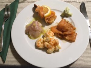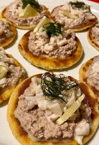 BLINIS TARTARE DI BRANZINO AFFUMICATO E SALSA DI NOCI