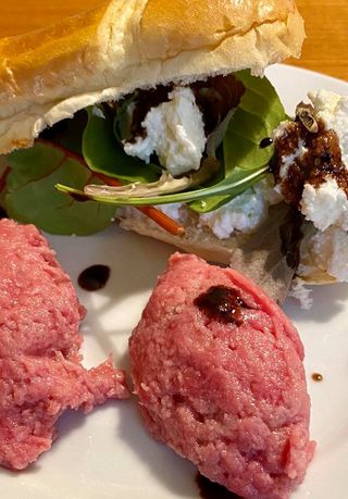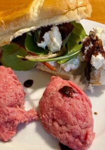 BATTUTA DI FASSONA, MOUSSE DI RICOTTA E MOSTO