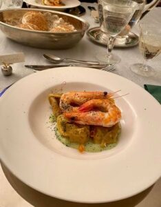 CAPPELLACCI DI GAMBERI SU CREMA DI PATATE E CAVOLO NERO